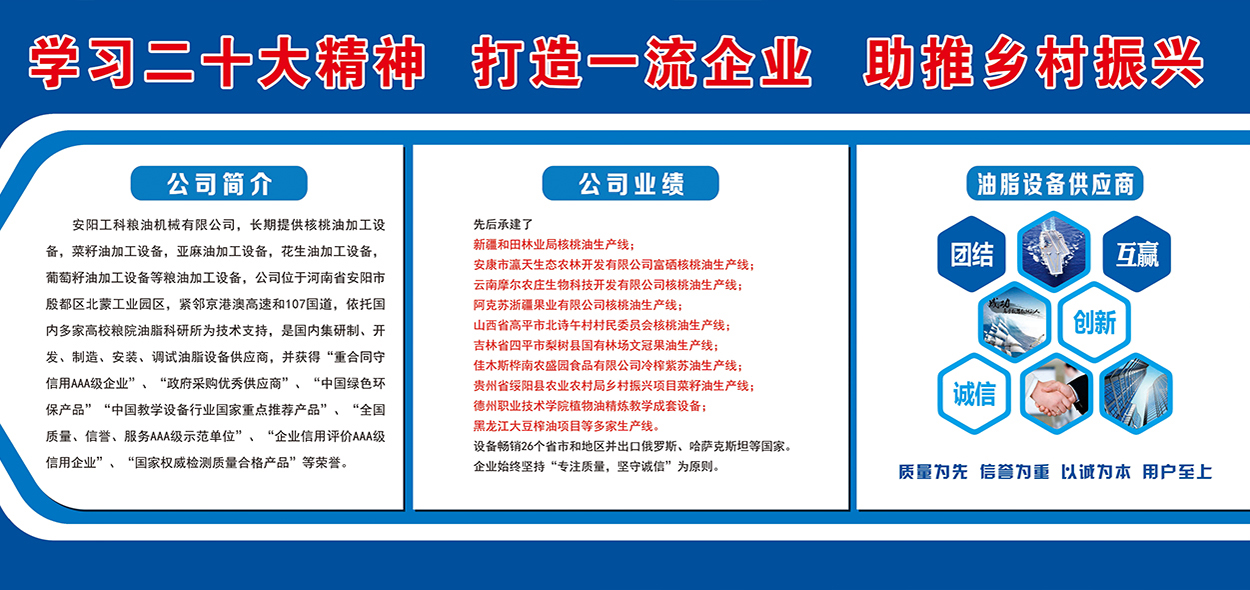 安陽工科糧油機械有限公司,長期提供核桃油加工設備,茶籽油加工設備,菜籽油加工設備,亞麻油加工設備,花生油加工設備,葡萄籽油加工設備等糧油加工設備,公司位于河南省安陽市殷都區(qū)北蒙工業(yè)園區(qū),緊鄰京港澳高速和107國道,依托國內(nèi)多家高校糧院油脂科研所為技術支持,是國內(nèi)集研制、開發(fā)、制造、安裝、調(diào)試油脂設備供應商,并獲得“重合同守信用AAA級企業(yè)”、“政府采購優(yōu)秀供應商”、“中國綠色環(huán)保產(chǎn)品”“中國教學設備行業(yè)國家重點推薦產(chǎn)品”、“全國質(zhì)量、信譽、服務AAA級示范單位”、“企業(yè)信用評價AAA級信用企業(yè)”、“國家權(quán)威檢測質(zhì)量合格產(chǎn)品”等榮譽。先后承建了新疆和田林業(yè)...